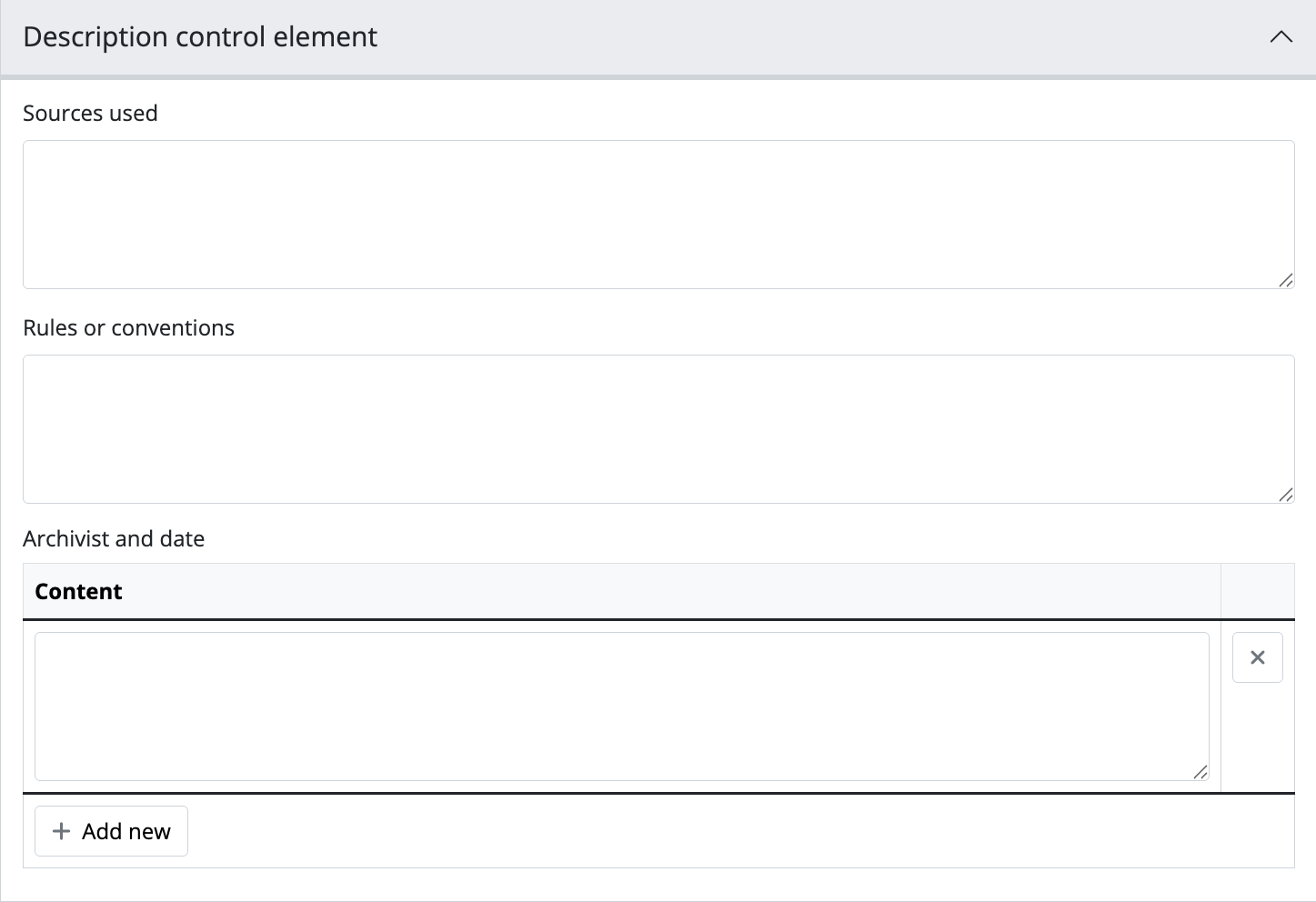 These fields can be used to add lower levels to a collection level description. Click “Add new” to create as many child levels as necessary.