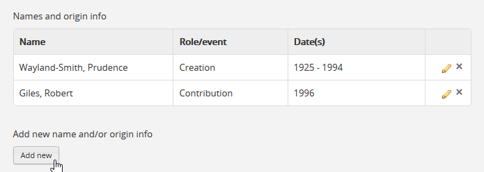 - In the “Dates of creation” information area of the RAD template, click the “Add new” button that appears under the heading, “Add new name and/or date(s).”