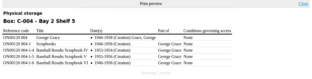 By clicking the print icon users can produce a report for the storage container which includes the Reference code, Title, Dates, Part of (fonds or collection name) and Conditions governing access.