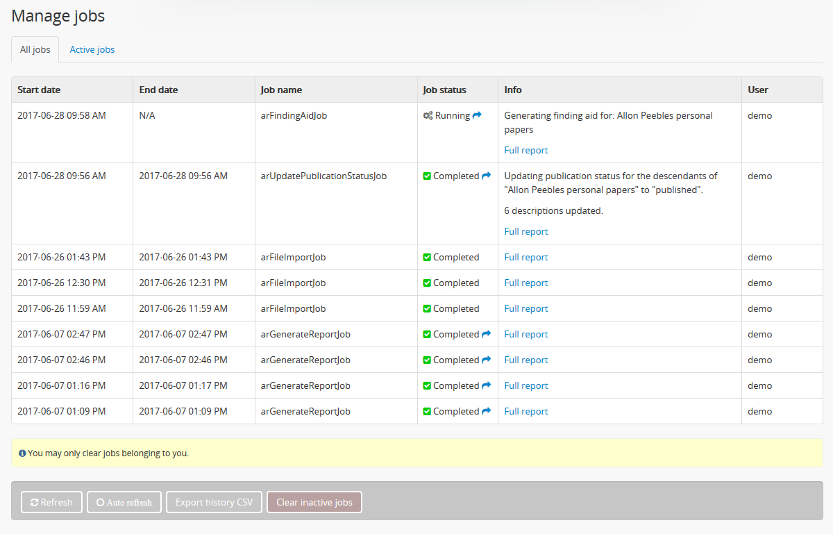 Note that the history of previous jobs is also cleared from the database. If you would like to preserve job history information before running this task, the Manage jobs page in the AtoM user interface includes an option to download a CSV of the job history. For more information, see: