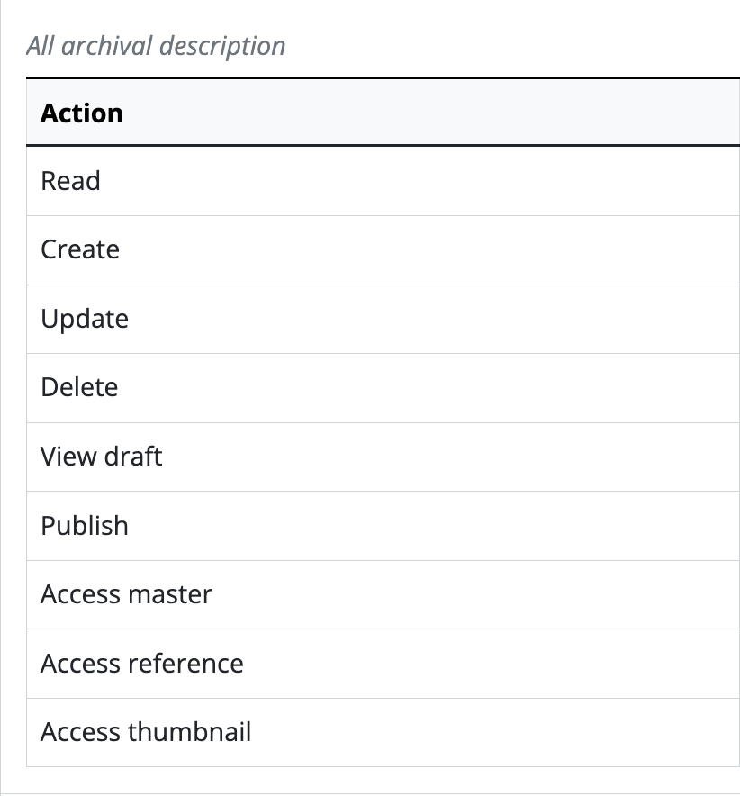 Each user group contains default access privileges, or Actions that define levels of access to functions in AtoM, ranging from view-only access to full administration rights. Each Action includes the option to select one of the following three access privileges, or Permission, displayed as radio buttons: