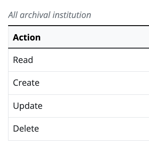 In AtoM, an archival institution provide users with the means of managing information about repositories and other institutions and organizations that hold archival materials or other cultural heritage items and artifacts. Users and user groups can Read and potentially Create, Update and Delete archival institutions when given permission.