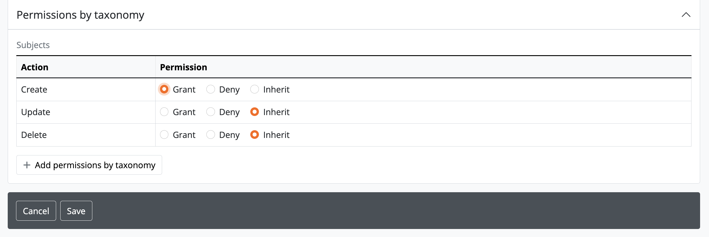 - Once you’ve added a taxonomy, the page will load the default Actions and Permissions (i.e. “Inherit”) for that group with regards to the taxonomy you have selected. Permissions can be edited as required.