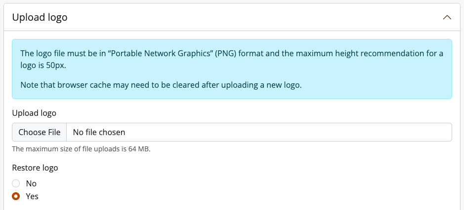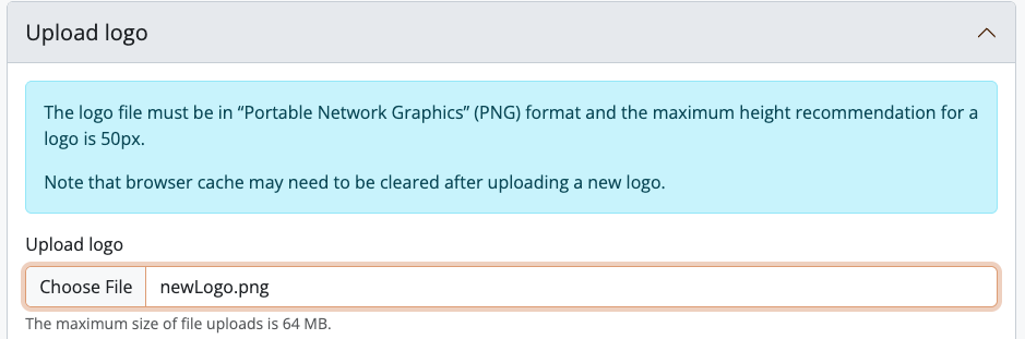 It is important to note that the logo must be in “Portable Network Graphics” (PNG) format, with a recommended maximum height of 50px. A logo exceeding 50px may break the page layout, unless a developer has altered the theme of the page.