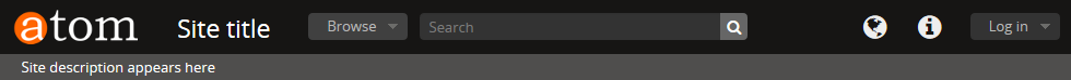 The site logo is the graphic that appears at the top of all pages in the left-hand corner of the header bar in AtoM. Clicking on the logo will take the user to the home page. AtoM ships with a default logo that can be replaced by administrators to theme the application to their own institution or network if desired: see Site logo.