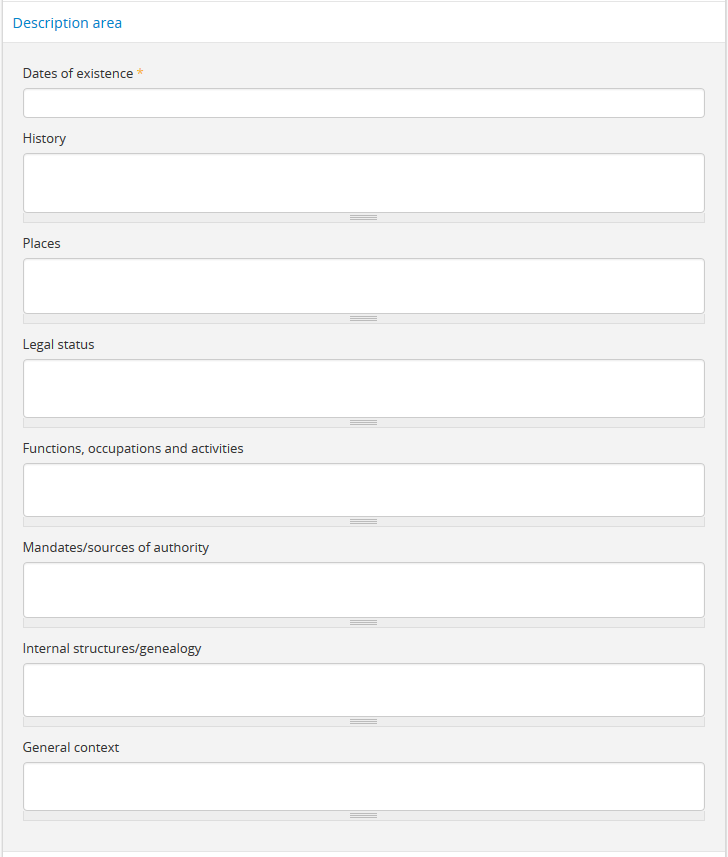 The data entry fields for the Description area of the ISAAR(CPF) authority record template.