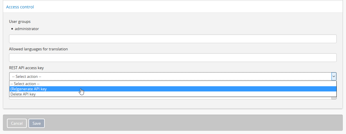 2. In the “Access control” area at the bottom of the edit page, click on the drop-down menu beneath the “REST API access key heading, and select “(Re)generate API key.”