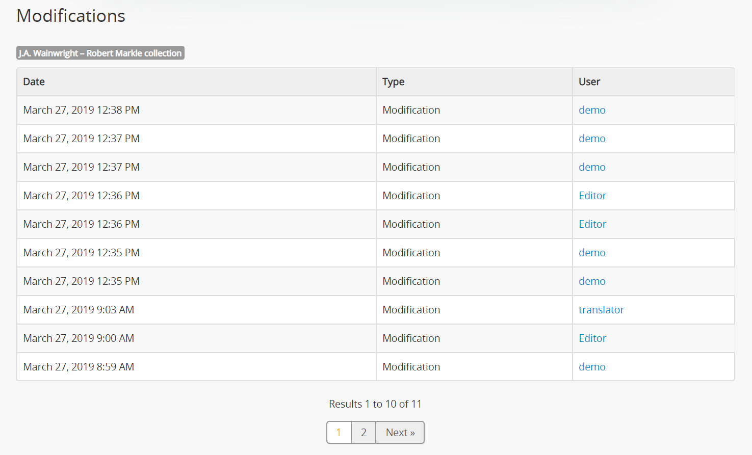 1. The number of results included in the Modifications page is determined by the Results per page setting in gears Admin > Settings > Global. If there are more results than the results per page setting, AtoM will display a pager at the bottom of the page, to allow you to page through the results.