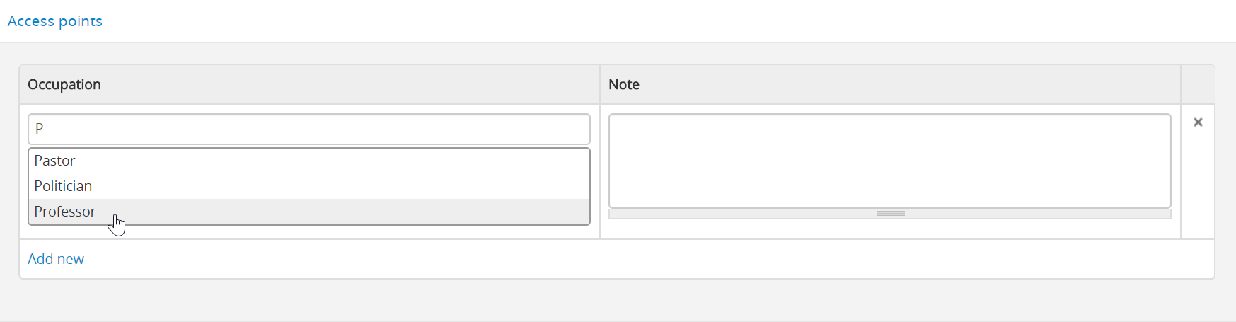 - Add data as required to each access point for “Occupation”, “Place”, and “Subject”. Each field is an auto-complete field, linked to the relevant taxonomy. If you have previously added terms to the taxonomies, then as you type, matches will appear below - click on a matching term that appears in the drop-down menu to select it. Alternatively, you can create a new access point simply by entering it into the field - on save, the access point will be saved as a term in the relevant taxonomy so you can reuse it in the future. The image below shows examples for the Occupation access point.