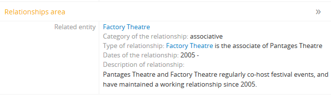- AtoM will reload the authority record in view mode. relationship is expressed in the “Relationships” information area of the authority record’s view page, and the related record’s name will appear as a hyperlink.