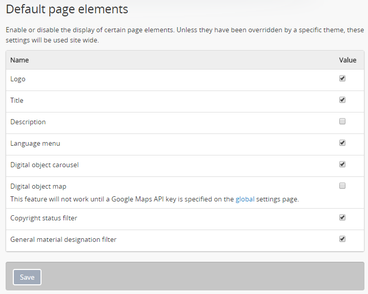 When making changes to the global settings in AtoM, don’t forget to click the “Save” button in the button block, located at the bottom of the “Global” settings information area.