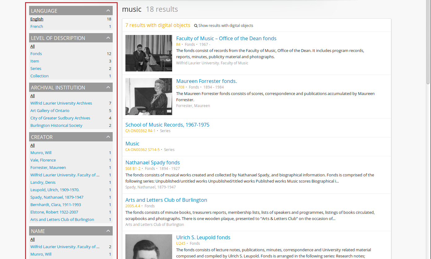 - Below the treeview, additional facet filters that can be applied to the browse results are listed, if relevant. For more information on using facet filters in AtoM, see: Facet filters.