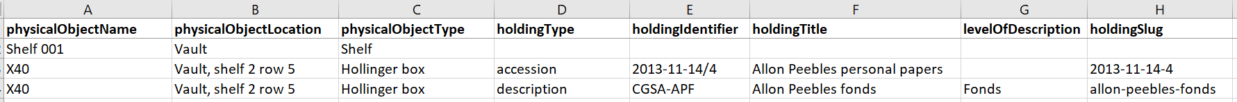 This CSV is intended as a report, and cannot be re-imported into AtoM as metadata. AtoM has separate CSV templates for importing accessions, archival descriptions, and physical storage data. For more information, see CSV import.