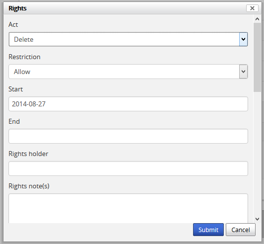 This section describes how to add a new rights record by using the rights dialog provided through the add/edit template. You can add rights to an existing record, or create a new record and add rights as you proceed. The following instructions will cover both scenarios.