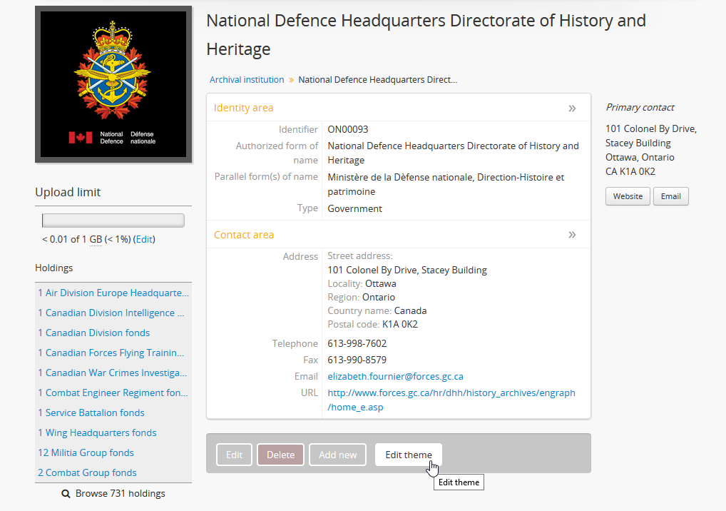 - Click on the “Edit theme” button in the button block at the bottom of the archival institution’s edit page.