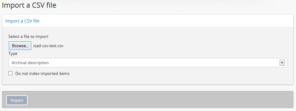 Once you’ve mapped the columns names in your CSV export to the corresponding AtoM-compatible CSV column names you may wish to perform a test import.