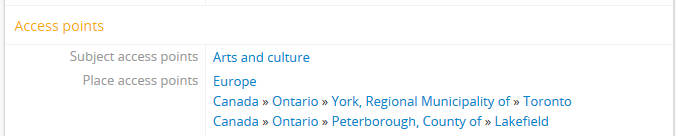 1. Navigate to the archival description to which you would like to add a new place or subject access point. You can do this either by searching or browsing - for more information on navigation in AtoM, see Access content.