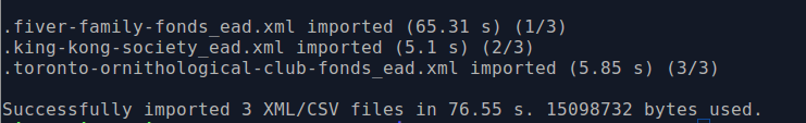 … where [x] is the number of files imported, [y] is a count of the time elapsed in seconds, and [z] is the memory used in bytes.