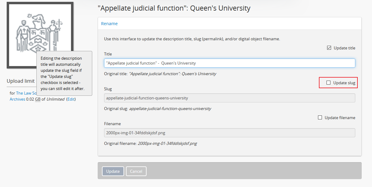 However, users with the appropriate permissions can edit the slug, the title of the description, or even the filename of an associated uploaded digital object after the description is saved, by using the “Rename” module.