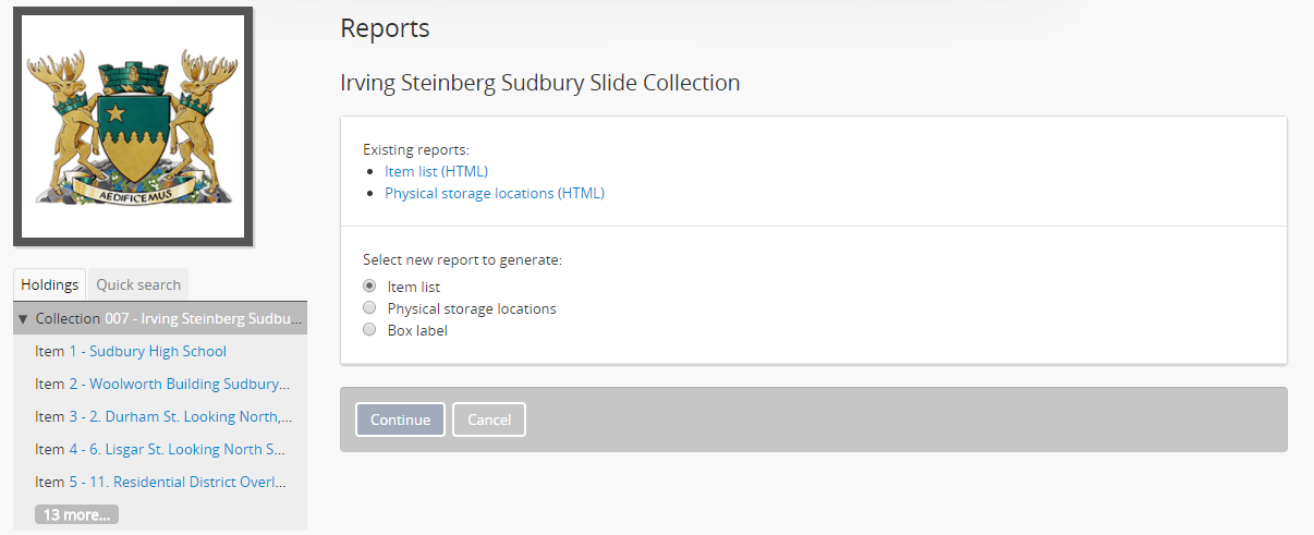 AtoM will reload the page to display report generation options. Options avalailable will depend on a) whether you are authenticated (i.e. logged in), and b) the lower-level descriptions available in this archival unit. For more information on file and item list reports, see: File and item list reports and printing.