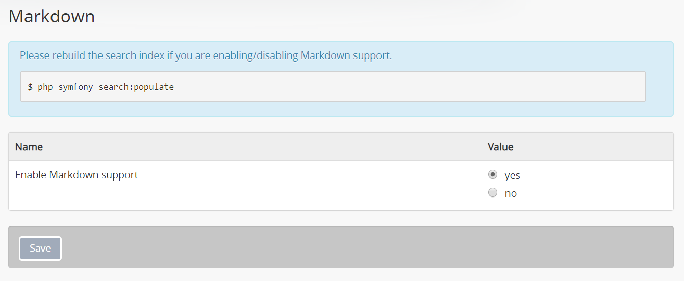 When making changes to the global settings in AtoM, don’t forget to click the “Save” button in the button block, located at the bottom of the “Global” settings information area.