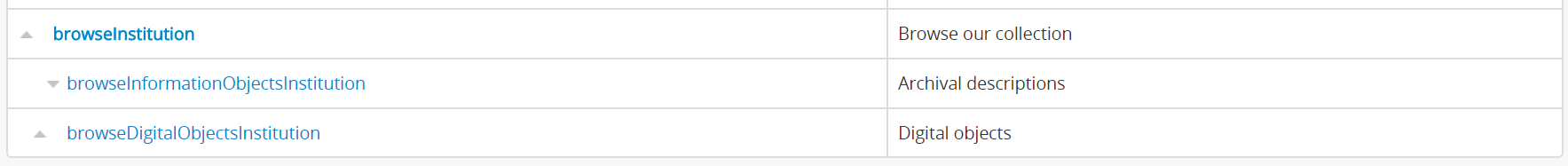 AtoM is flexible enough to support descriptions a variety of cultural materials such as archival, library, museum, and art gallery collections. The code, therefore, uses generic terms for entities. Administrators can specify how they want these terms to appear in the user interface labels to suit the institution’s collections. The default labels that ship with AtoM are terms typically used by archival institutions, but can be customized as desired. Additionally, some of the user interface label settings allow an administrator to customize the display labels on particular user interface elements, such as the text shown for collapsing and expanding the full width treeview when the Make full width treeview collapsible on description pages is enabled.