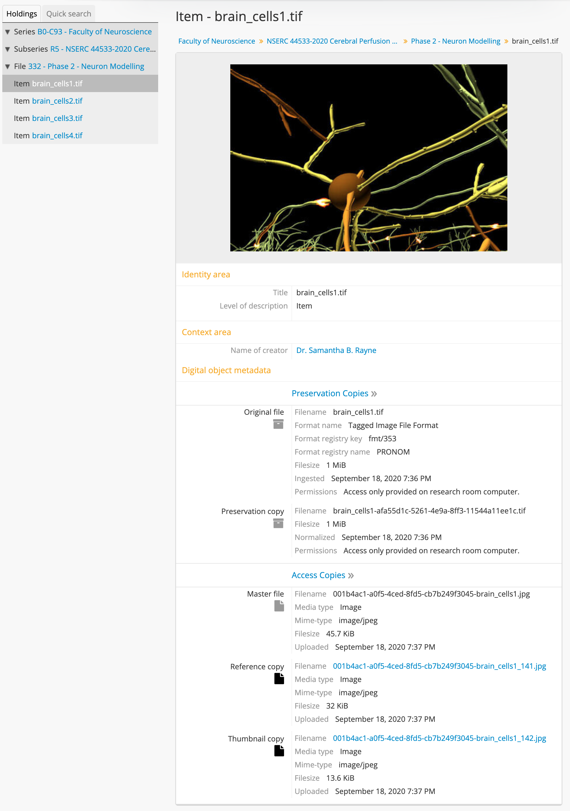 When the preservation system uploads a DIP with digital objects to AtoM, it will generate “Master file”, “Reference copy”, and “Thumbnail copy” representations with their metadata displayed in the “Access copies” subsection.