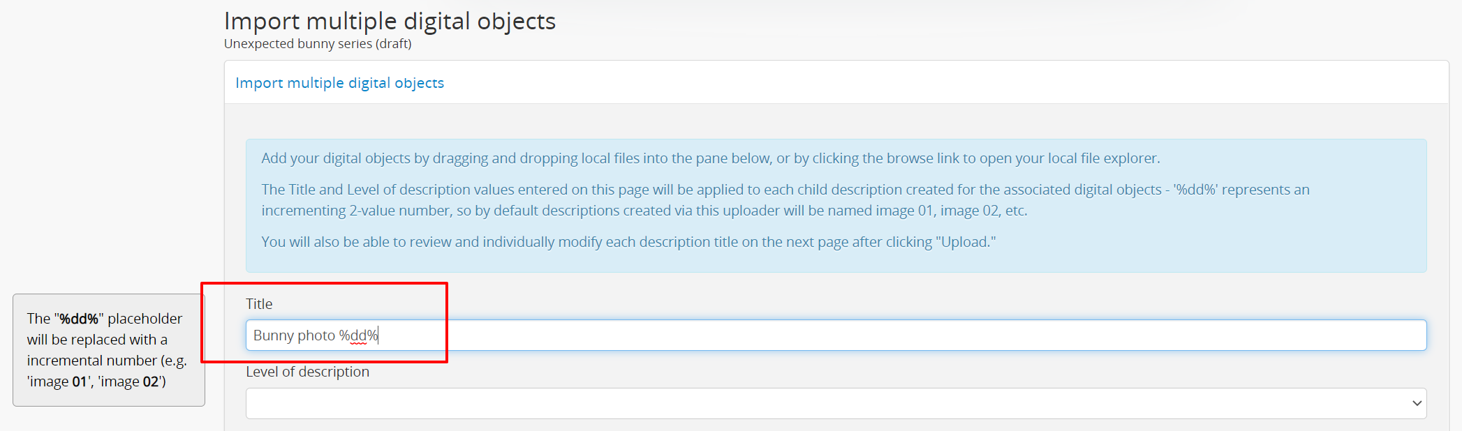 In AtoM, there is a 1:1 relationship between archival descriptions and digital objects - that is, only one digital object may be associated with an archival description, and all digital objects require an associated description. However, to enable a rapid workflow where users can upload multiple digital objects without first having to create associated descriptions, AtoM includes an option to upload multiple digital objects at once, as children of a selected archival description. Users can choose what level of description is used when the placeholder descriptions are created; a title can also be added to each uploaded digital object, which will then be used as the title for the related description.