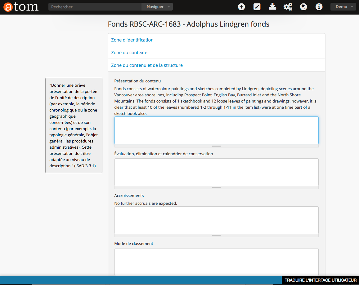 3. AtoM returns the user to the view mode. The translated fields will now appear in the new language of translation. Any content not yet translated will continue to appear in the source language.