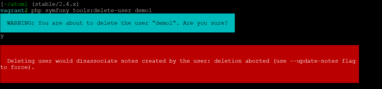 AtoM provides a method to delete a user account via the user interface, but you can also delete a user directly from the command-line interface. To do so, you will need to know the username of the user you wish to delete. The basic syntax for the command is: