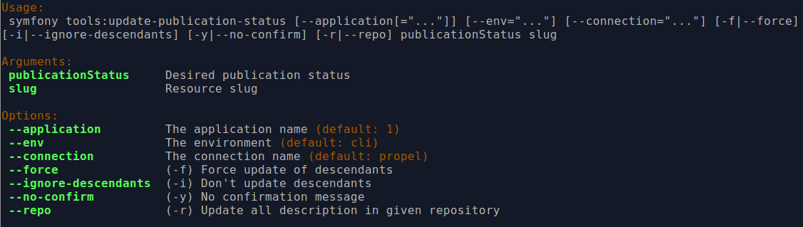 By running php symfony help import:dip-objects we can see the help page and options included with the task: