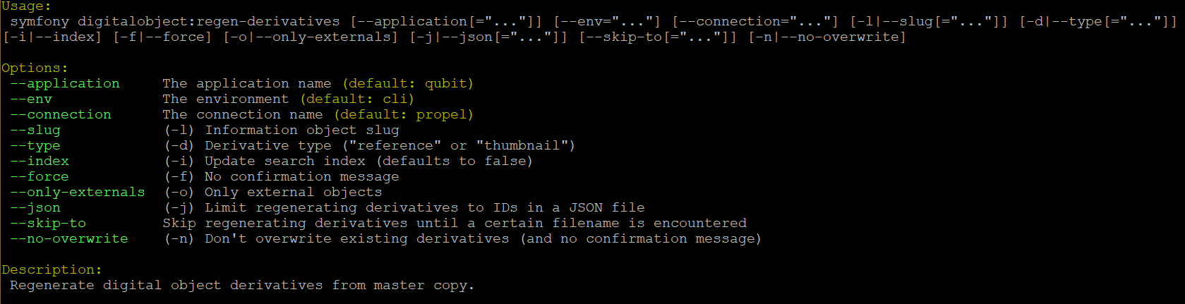 The --slug option can be used to target specific derivatives associated with a description, using the description’s slug as criteria. Any digital object attached or linked to the description whose slug is provided as criteria will have its derivatives regenerated. Example use: