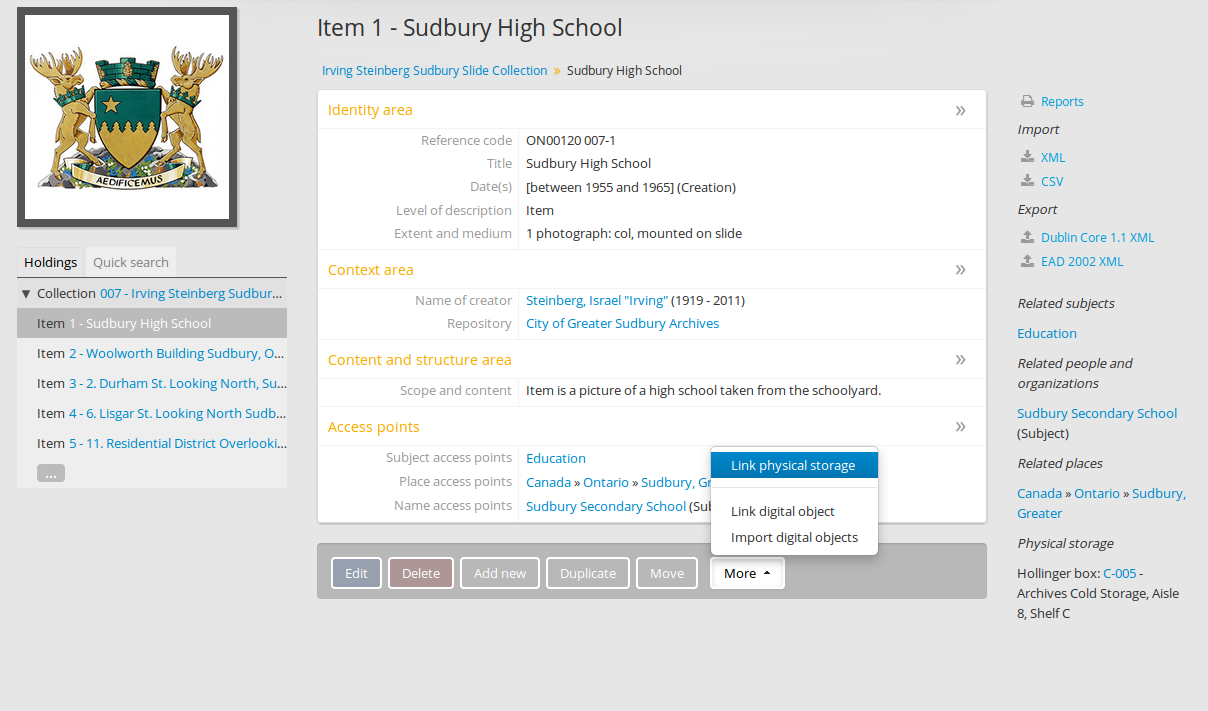 AtoM allows archival institutions to create relationships between archival descriptions and their physical storage locations.