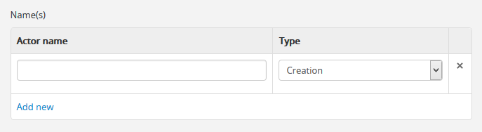 You can leave the “Actor name” field blank. Lower levels inherit creator information from higher levels: use only if the creator is different at the lower and higher levels. At the highest level of description, you should always include the creator.
