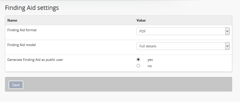 When making changes to the global settings in AtoM, don’t forget to click the “Save” button in the button block, located at the bottom of the “Global” settings information area.