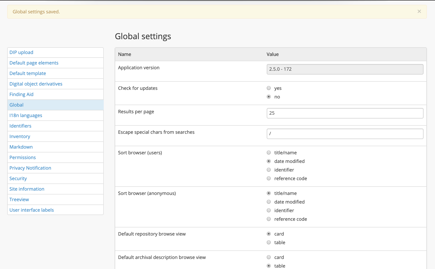 Global settings allow administrators to control certain aspects of how AtoM appears and behaves.