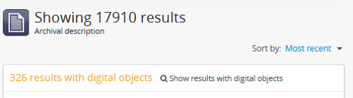 The sort buttons (Sort by and Direction) are navigational tools that appear on some browse and search pages throughout AtoM. They allow a user to change the sort order of the results being displayed. Common values used in the Sort by button as it appears in AtoM include: Alphabetic, Relevance, Identifier, Reference code Most recent, or Start date and End date. The Direction sort button reverses the direction (ascending or descending) of items according to the Sort by option.