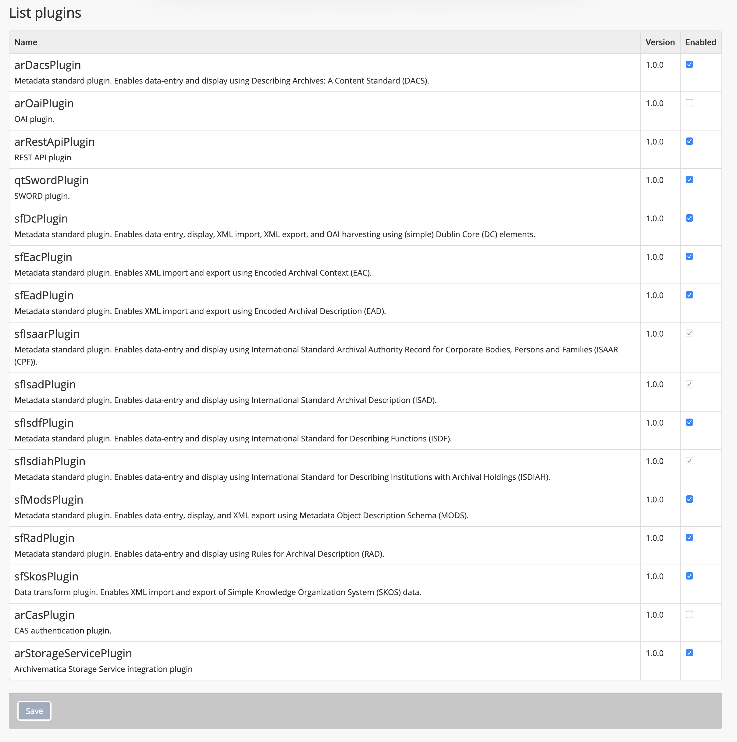 Most plugins based on ICA standards are permanently enabled in AtoM. These include the International Standard Archival Authority Record for Corporate Bodies, Persons and Families (ISAAR (CPF)), the International Standard Archival Description (ISAD) and the International Standard for Describing Institutions with Archival Holdings (ISDIAH).