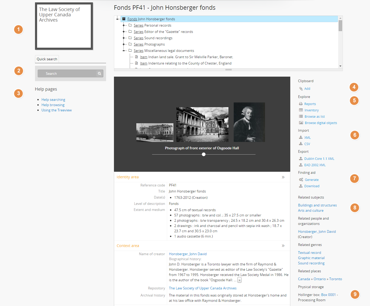 In the figure to the right, the record for an item is highlighted, showing the placement of the file in a hierarchy, e.g. what series and fonds does it belong to. In this example, the user is viewing Item 2000029-02P in a Series called “Photographs,” in a fonds titled the “John Honsberger fonds.” The treeview allows the user to see the current record’s position in the collection hierarchy, and by clicking on the blue hyperlinked titles of other records, the user can navigate easily from one record to another contained in the same fonds or collection.