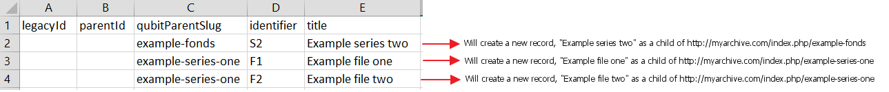 Even if you are importing your descriptions as top-level records, we still recommend using a legacyId value during import. Simply leave both the parentID and qubitParentSlug columns blank for any row you want to import as a top-level description.