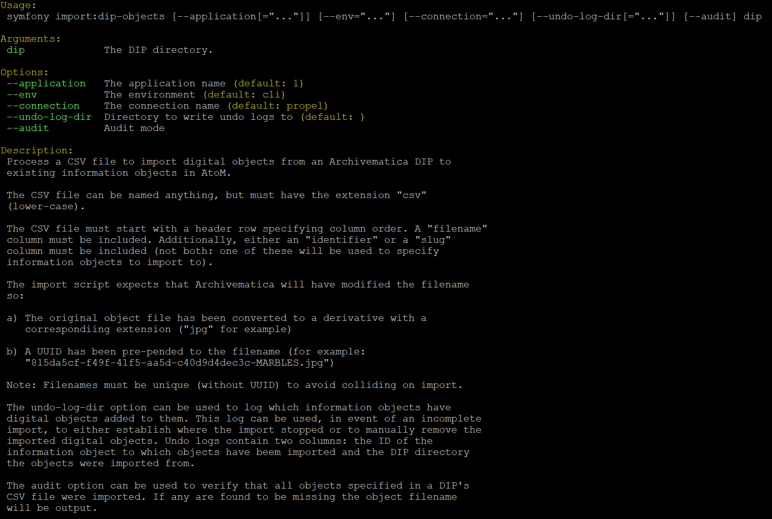 While a workflow that will automatically upload DIPs from Archivematica to AtoM is supported (see the links above), there may be cases where an archivist chooses to store a DIP, and then wishes to upload it later without having to run it through the re-ingest process. In that case, a system administrator can use this task to manually attach DIP objects to existing archival descriptions in AtoM.