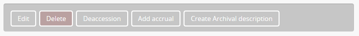 1. If you click on the “Delete” button, AtoM will offer a warning. If the accession has accruals associated with it this will be noted in the warning message - accruals will not be deleted with an accession, and must be deleted separately