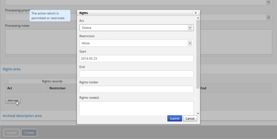 In the Edit accession record screen, under the Rights information area, you can enter one or more rights restrictions related to the accession using the rights record. For a full explanation of rights, go to the Rights page.