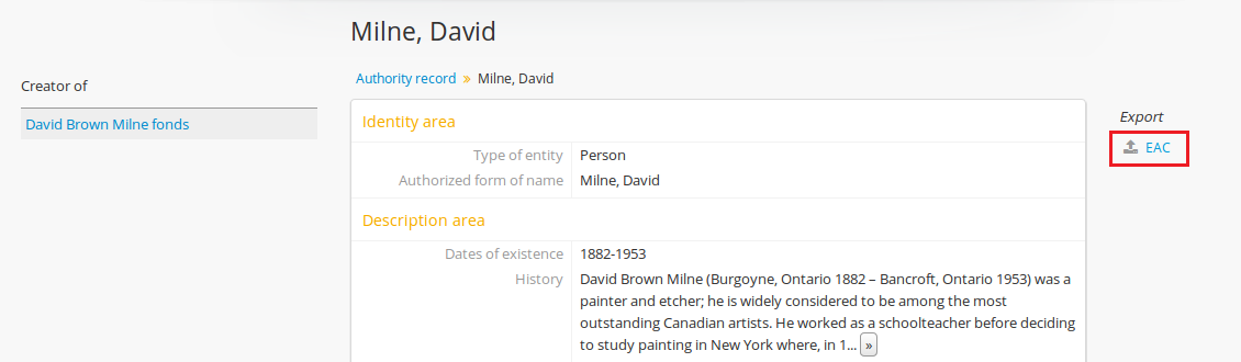 In an authority record view page, select EAC under Export. This will export the authority record currently being viewed.