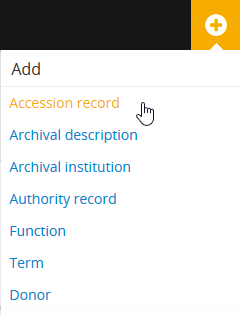 1. In the main menu located in the header bar, click the plus “Add” menu and select “Accession records” from the drop-down menu.