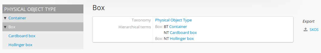 Another method of adding a new storage type is to click “Add new” when viewing an existing Physical Object type. This will automatically nest the new term as a child of the existing term.