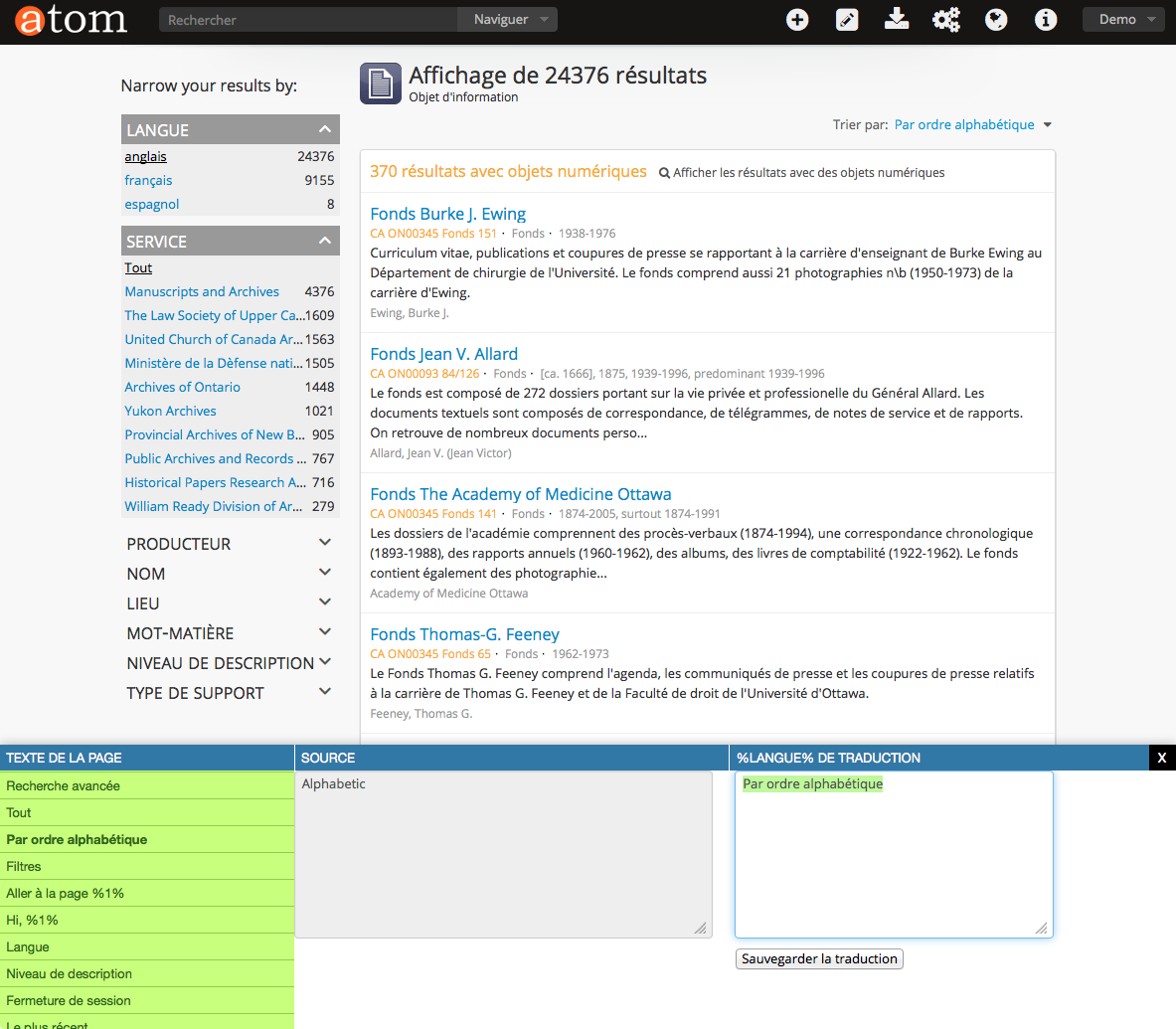 4. Click on the Save Translation button when you are finished. AtoM will close the translation panel. All user interface elements on the page should now appear as translated.