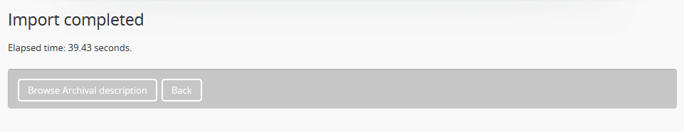 Once you’ve prepared your import, you may want to clone your AtoM site and test your import on the clone before importing to your production AtoM installation. This prevents you from having to delete any improperly imported data. During import testing if you want to delete all imported data you can use the command-line purge tool.