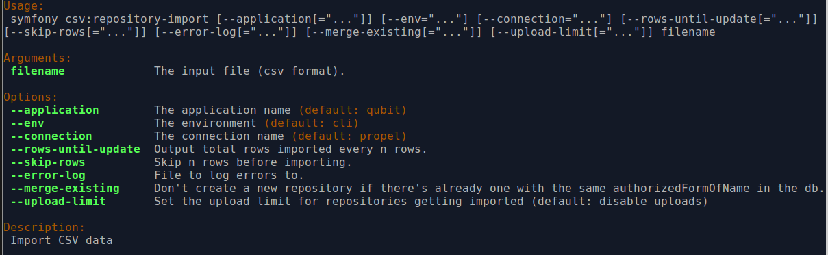 By typing php symfony help csv:authority-import into the command-line from your root directory, without specifying the location of a CSV, you will able able to see the CSV import options available (pictured above). A brief explanation of each is included below.