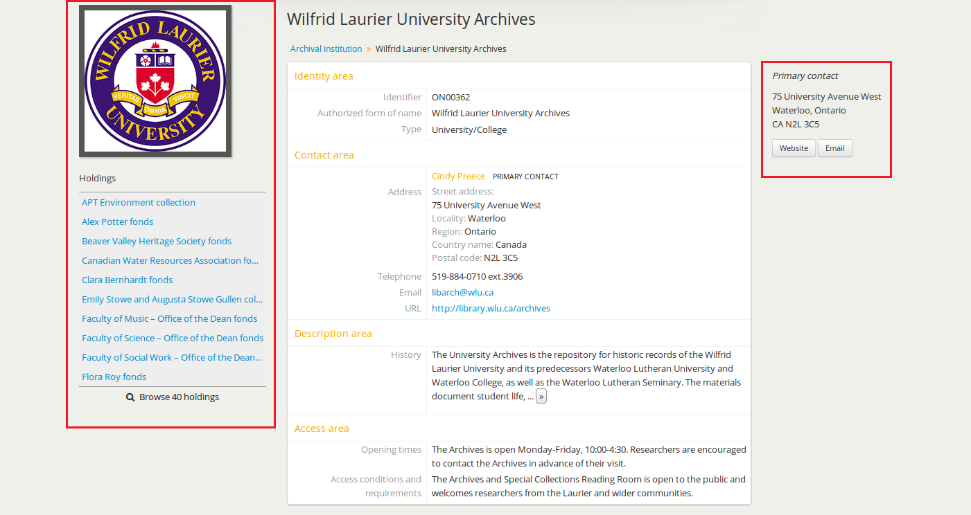 - The primary contact information for the institution, including buttons that link to the institution’s website and email. The contact information is drawn from the information added to the “Contact” area of the archival institution record.